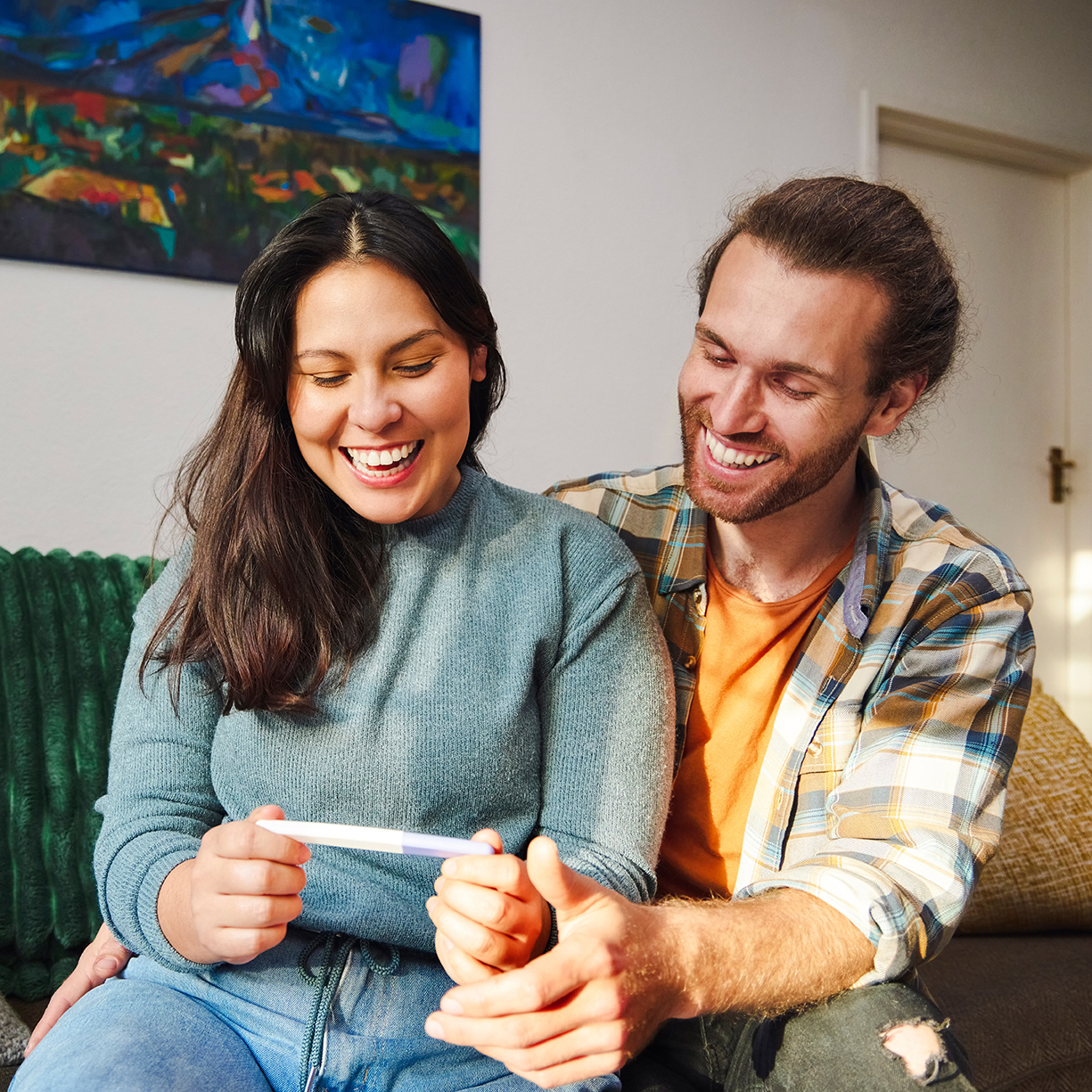 Cropped shot of an affectionate young couple happily looking at a positive pregnancy test while sitting in the living room at home